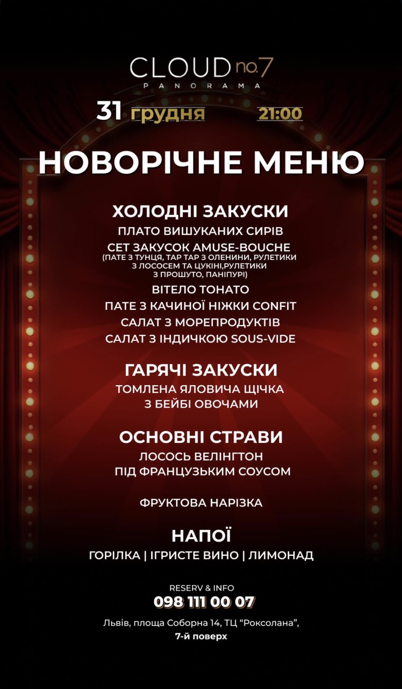 Плануємо неймовірний Новорічний вечір! 31 грудня з 21:00 Новий рік у стилі Moulin Rouge — це гарантовані яскраві емоції. Можливо Ви саме шукаєте, де вигуляти своє саме яскраве і вишукане вбрання. Запрошуємо на незабутнє шоу! За нами - новорічне меню від Шефа та новорічна шоу програма: •Ведучі - Юрій Корнилюк та Юрій Новосад, професіонали, які створять атмосферу свята • Жива музика від кавер-бенду VICTORIA SNIGUROVA & band, найкращі хіти в нових обробках • Музичний супровід від фортепіано та саксофоніста - мелодії, які запам’ятаються. • Діджеї - Dj Rost, Dj Teddy, вони забезпечать драйвову атмосферу та незабутні ритми • Артисти в атмосферних костюмах - унікальні образи, що додадуть інтриги та загадки цій новорічній ночі. Не пропустіть можливість насолодитися яскравим шоу і точно незабутнім вечором в стилі Moulin Rouge А наш Шеф-кухар створить для вас справжнє гастрономічне свято: ▪️холодні закуски ▪️гарячі закуски ▪️основна страва ▪️десерт Резерв відбувається у залах: ▪️Panorama hall - 8500 грн ▪️Banket hall - 8500 грн ▪️Vocal bar - 6000 грн ▪️Купол - 5000 грн * У вартість входить: яскрава шоу-програма, смачна їжа від шеф-кухаря, а також пляшка алкоголю на вибір) Додатково, в новорічну ніч діятиме послуга «Корк фі» Захід починається о 21:00, закінчення плануємо о 5:00 Вартість послуги «Корк фі»: пляшка до 1л - 500 гривень У новорічну ніч вікові обмеження не діють☺️ Діти до 7 років безкоштовно, від 8 до 14 - знижка 50% | |